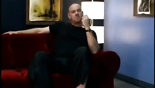 Bald dude is fond of licking foot of naughty redhaired MILF Samantha St. James wrecking his rectum with a strap-on.