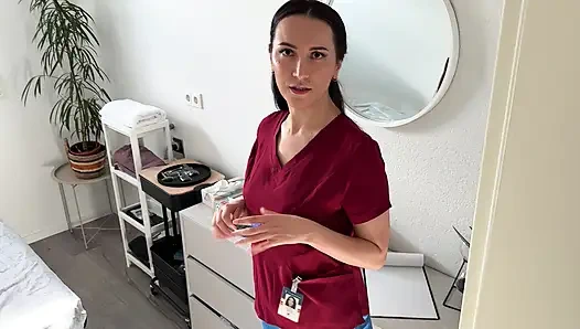 When a horny guy books a massage with a smoking hot brunette masseuse, things quickly get out of control. She tells him to strip and lie down, but as soon as she starts rubbing his legs, he can't resist and starts secretly stroking his hard cock under the towel. He gets so turned on that he accidentally explodes all over her tight ass and pants! Shocked at first, the sexy masseuse quickly turns the situation around. Why didn't you just ask me to jerk your dick? she teases. What follows is an intense handjob with her white latex gloves, followed by a sloppy, passionate blowjob that ends with him cumming for the second time - straight into her eager mouth. Two massive loads in one session? This is one massage he'll never forget!