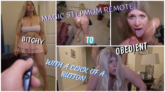 Step Son Buys magic human remote control, step mom doesn't believe him so he Uses the remote on her, she jump up and down, her big boobs pop out, She Sucks and strokes, he fucks her cums in her mouth.