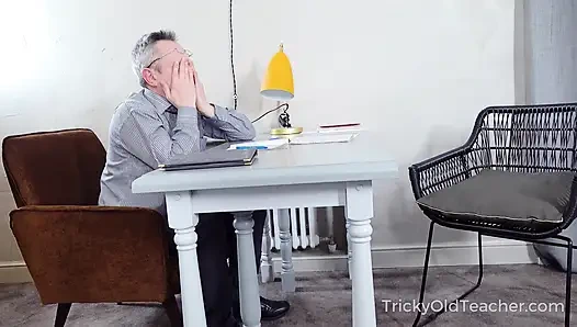 As any other student, sexy brunette wants to get the highest grades possible and she does not want to study or to write essays or do anything boring. She wants to party, flirt with boys and still get her education and diploma. In order to achieve the goal, she pays her grey-haired teacher a visit and begs him to help her. Old teacher does not want to listen to her at first but later he surrenders to her charms and her gentle hands that caress him and bring him to sex heaven. Sure, the old teacher wants to get total satisfaction and this is why he puts her into doggy position to cover beautiful brunette face with his old sperm.